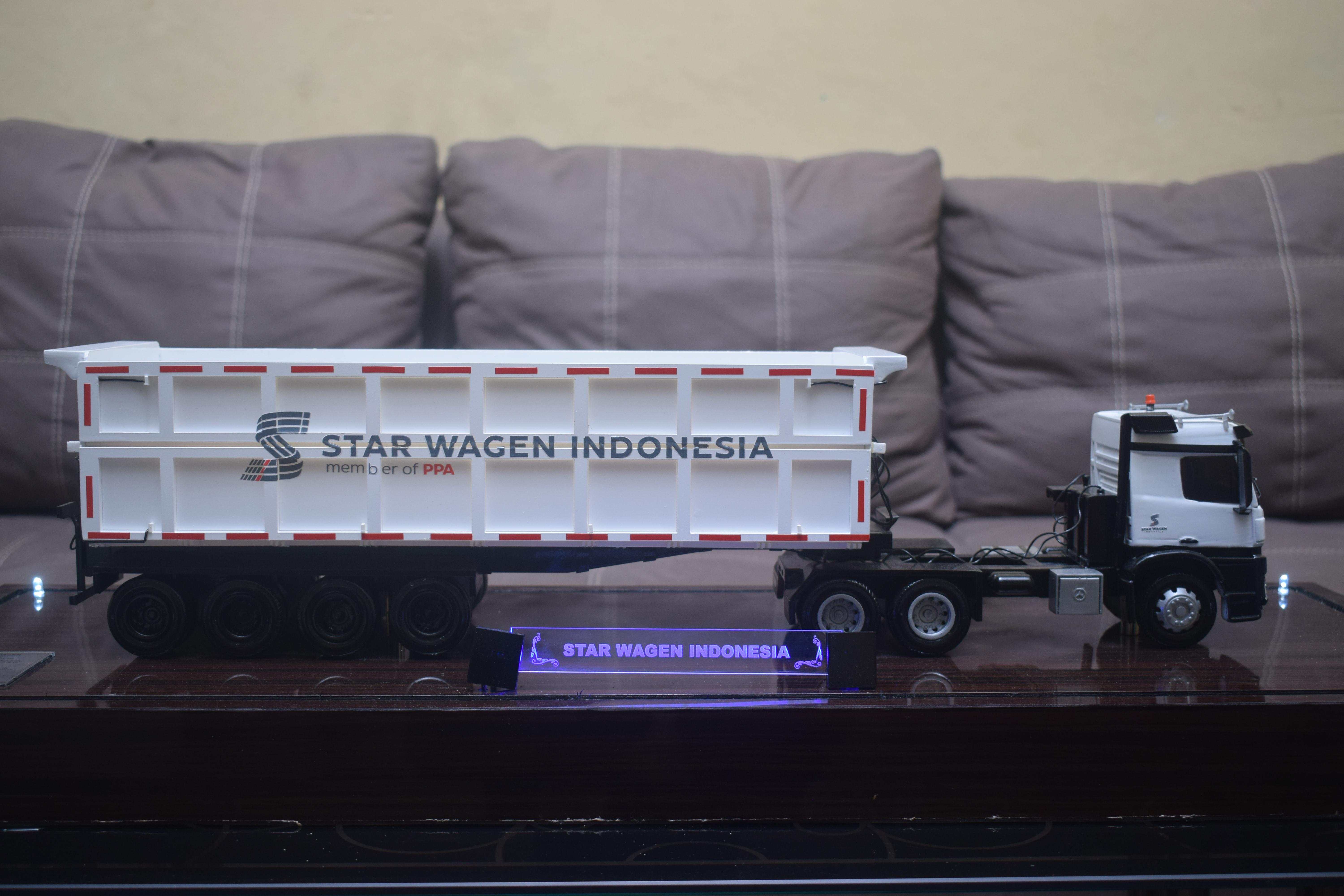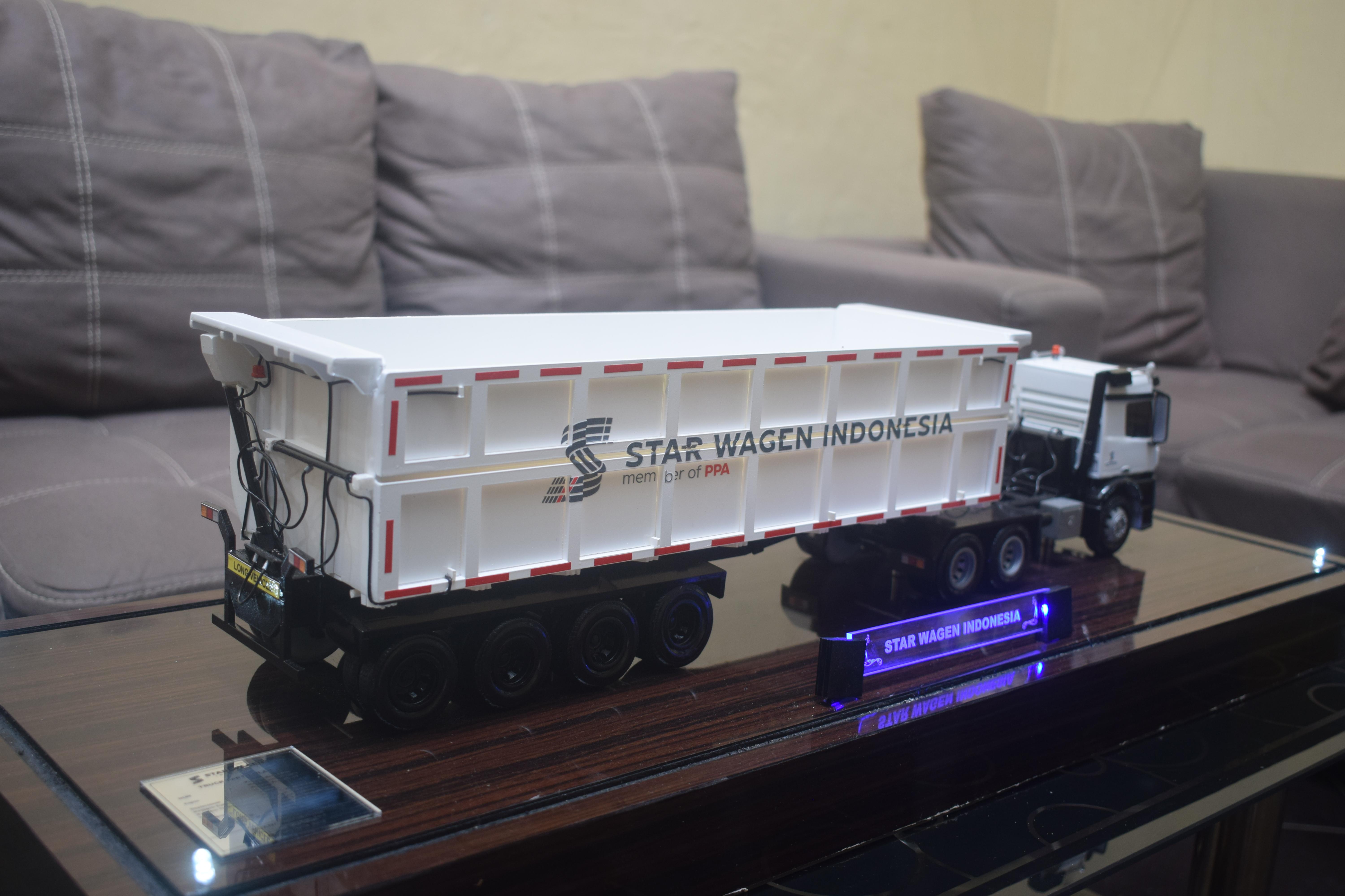 1. Miniatur Truk Trailer Star Wagen ini berbahan dasar fiber, acrylic, resin, artificial part, kayu sebagai tatakan serta dilengkapi pencahayaan dengan lampu led (optional), kemudian kami bingkai dengan etalase kaca (optional).