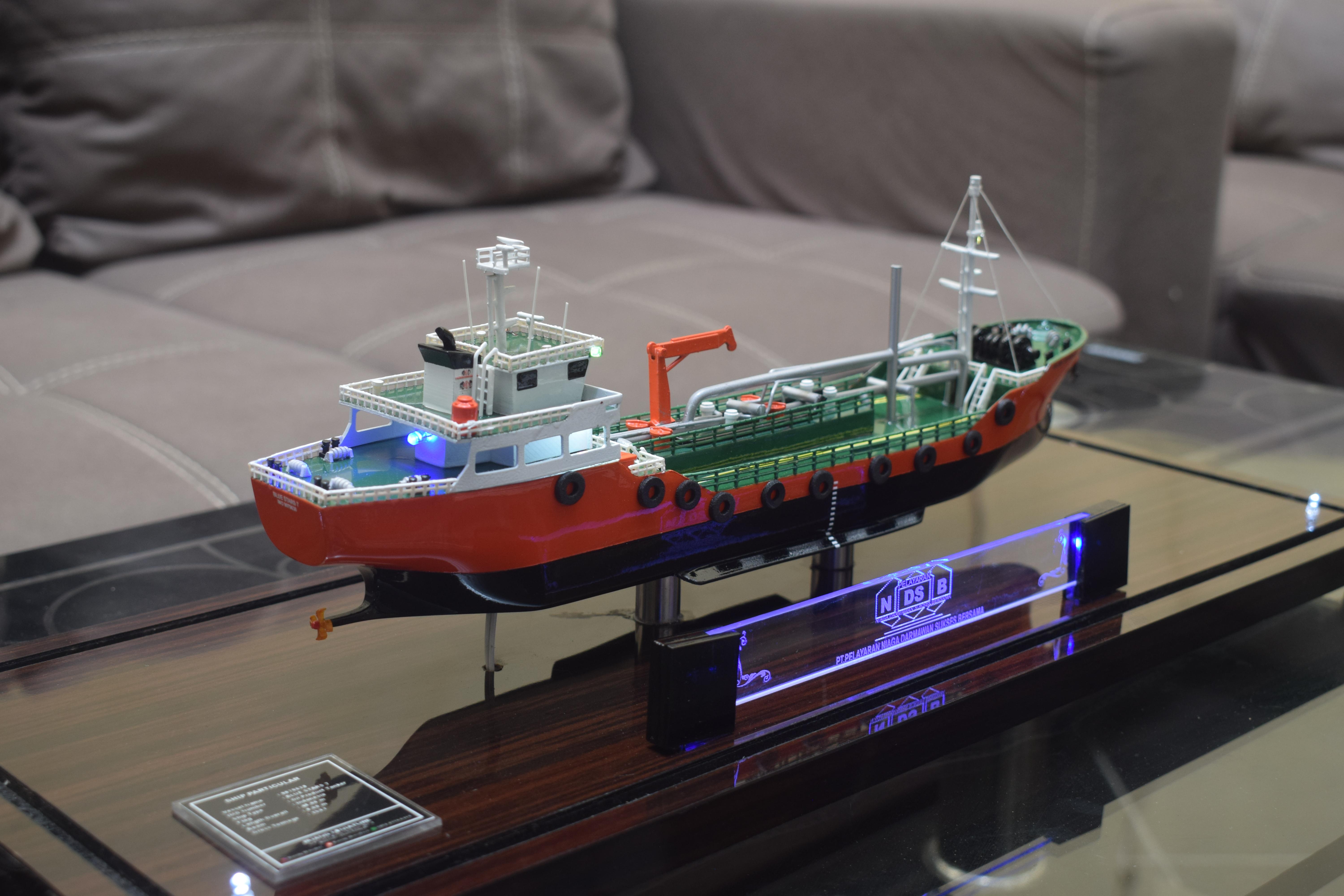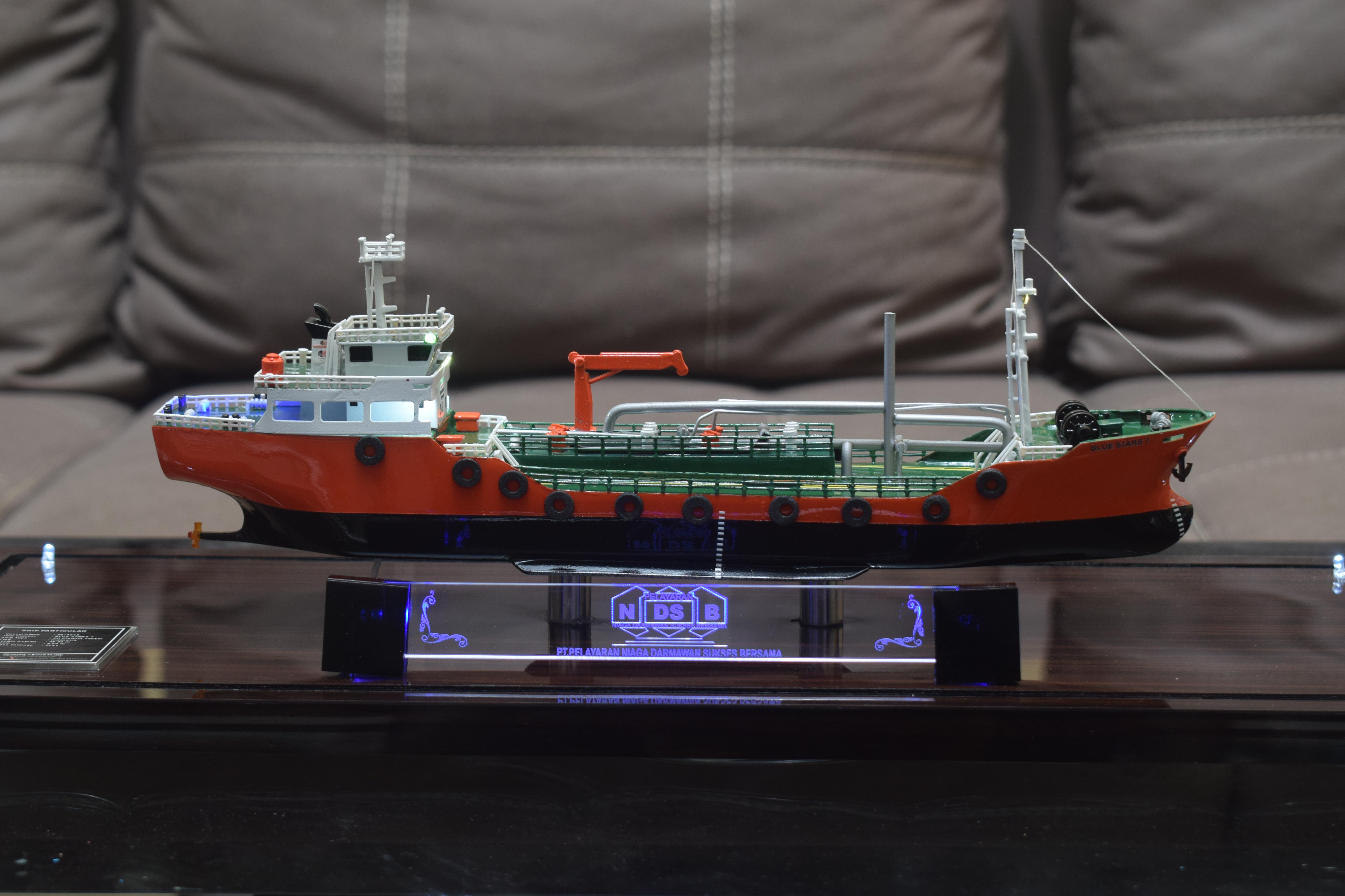 1. Miniatur Kapal SPOB Blue Stars 7 ini berbahan dasar fiber, acrylic, resin, artificial part, kayu sebagai tatakan serta dilengkapi pencahayaan dengan lampu led (optional), kemudian kami bingkai dengan etalase kaca (optional).