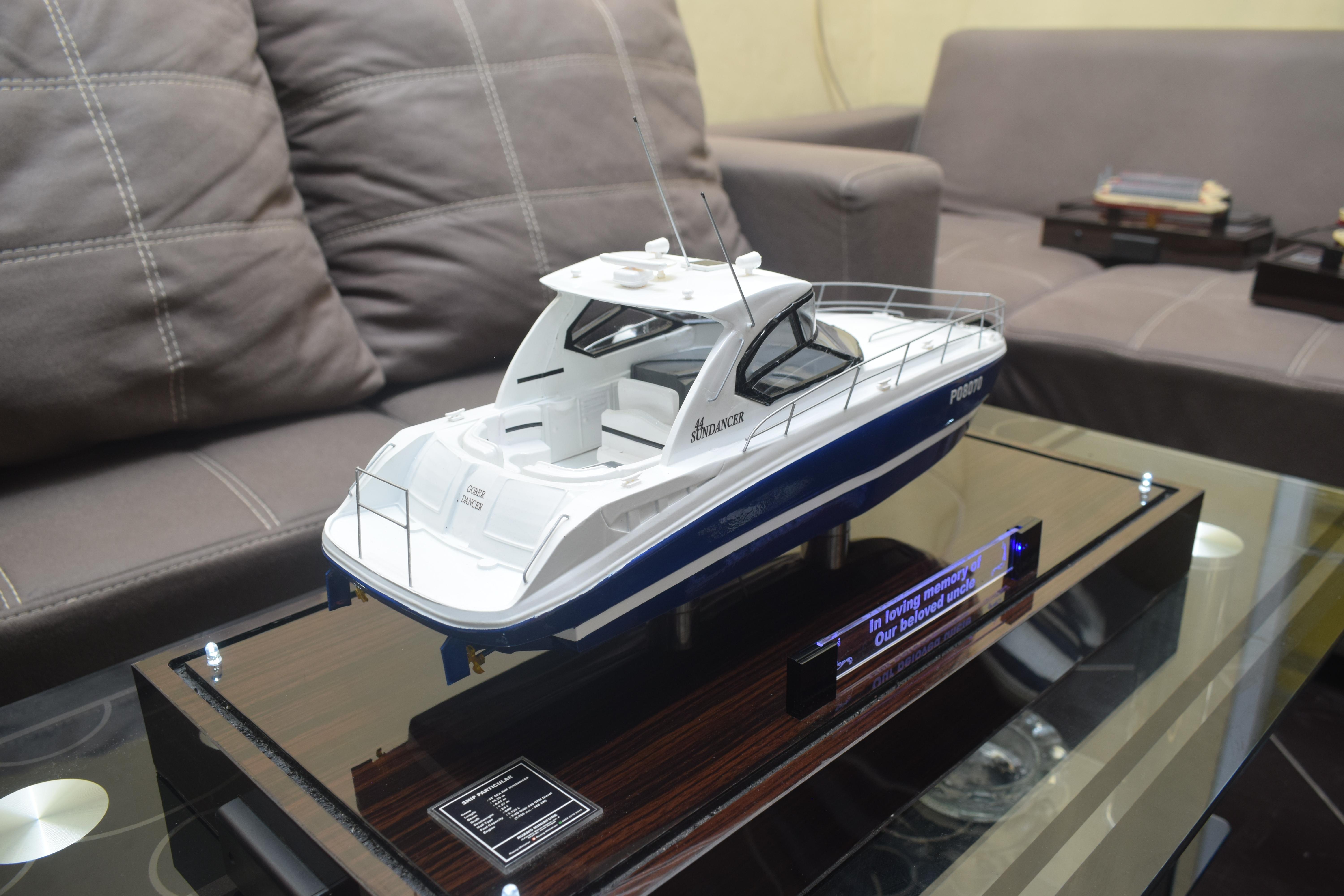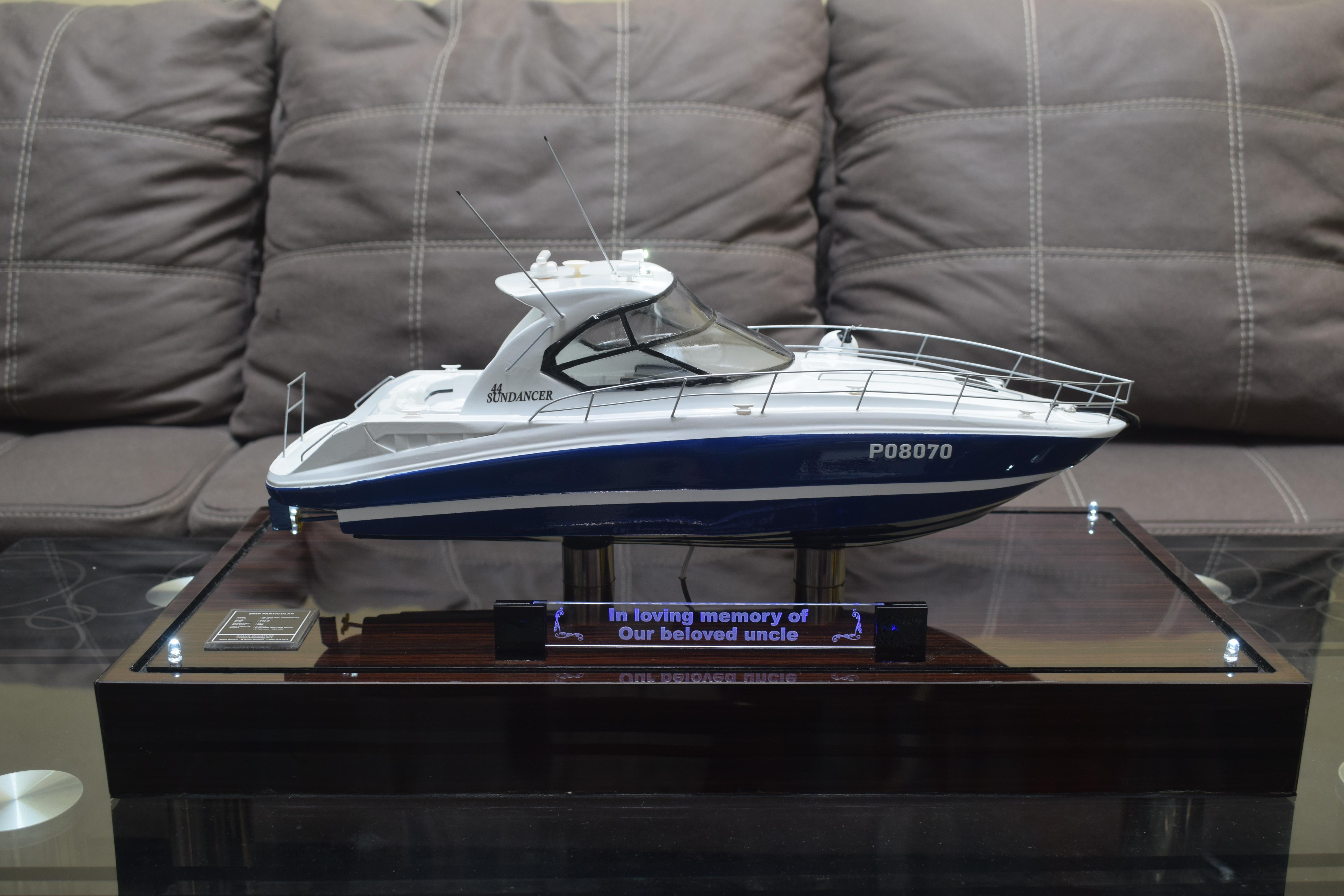 1. Miniatur Kapal Yach Sundancer ini berbahan dasar fiber, acrylic, resin, artificial part, kayu sebagai tatakan serta dilengkapi pencahayaan dengan lampu led (optional), kemudian kami bingkai dengan etalase kaca (optional).