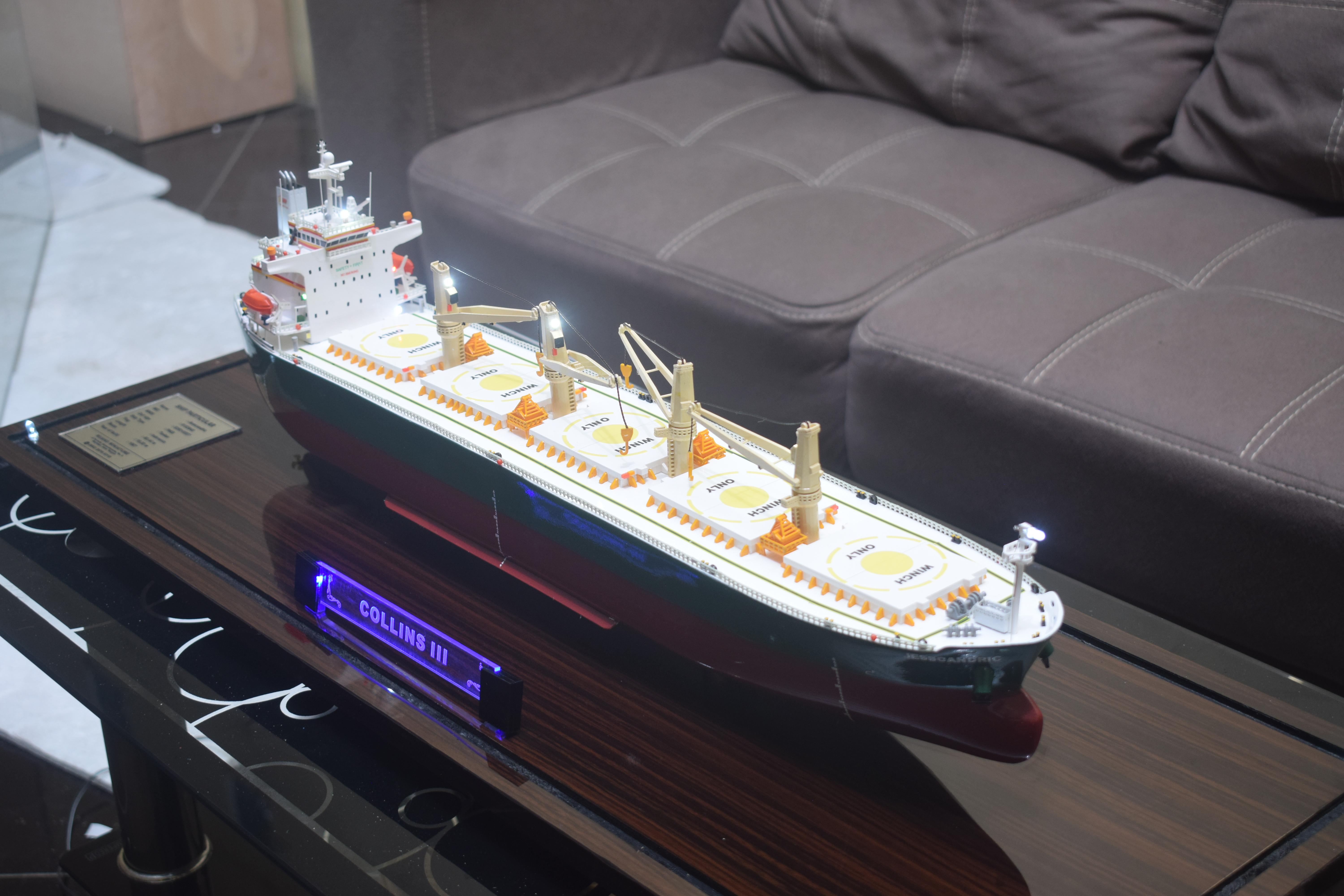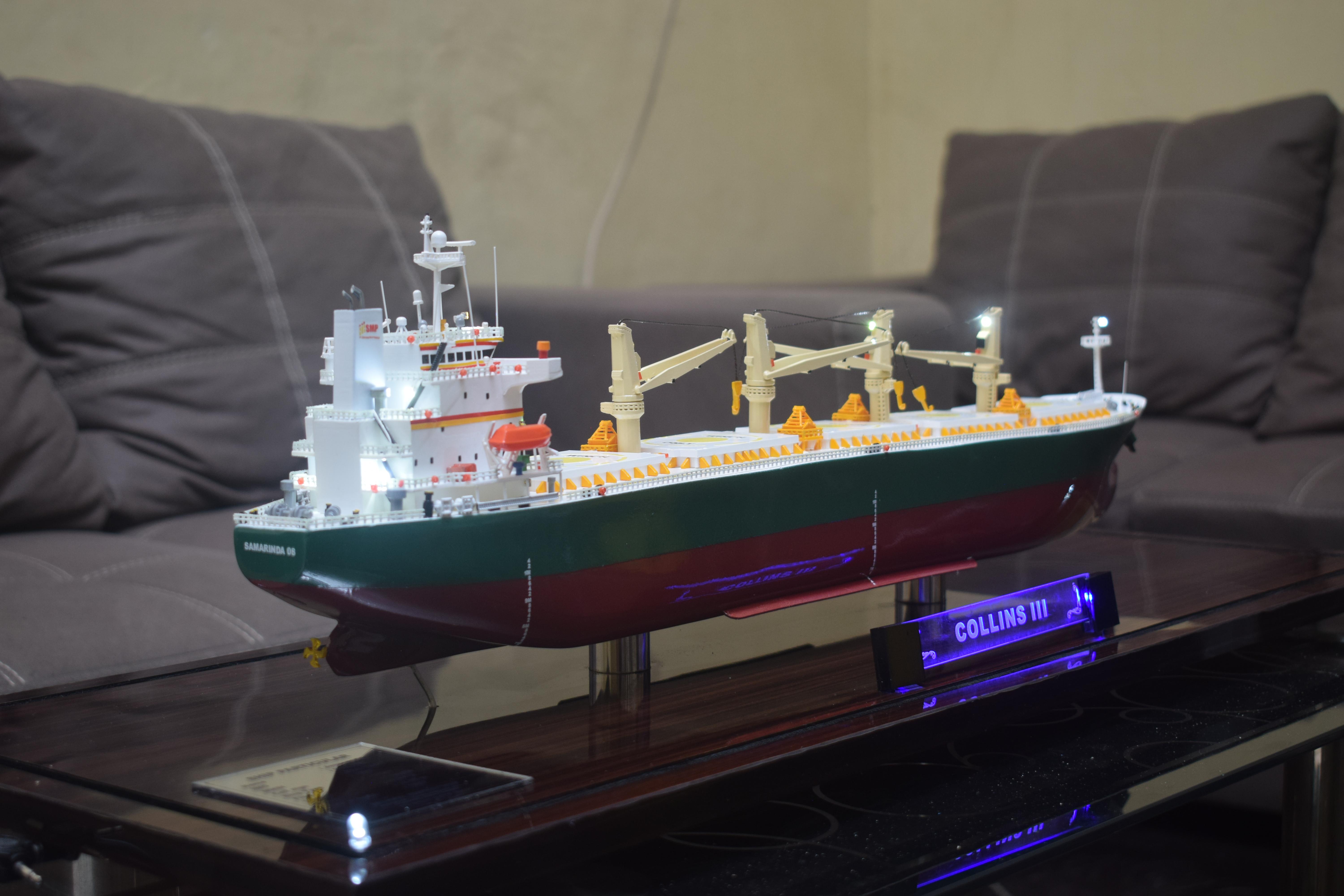 1. Miniatur Kapal Bulk Carrier Collins ini berbahan dasar fiber, acrylic, resin, artificial part, kayu sebagai tatakan serta dilengkapi pencahayaan dengan lampu led (optional), kemudian kami bingkai dengan etalase kaca (optional).