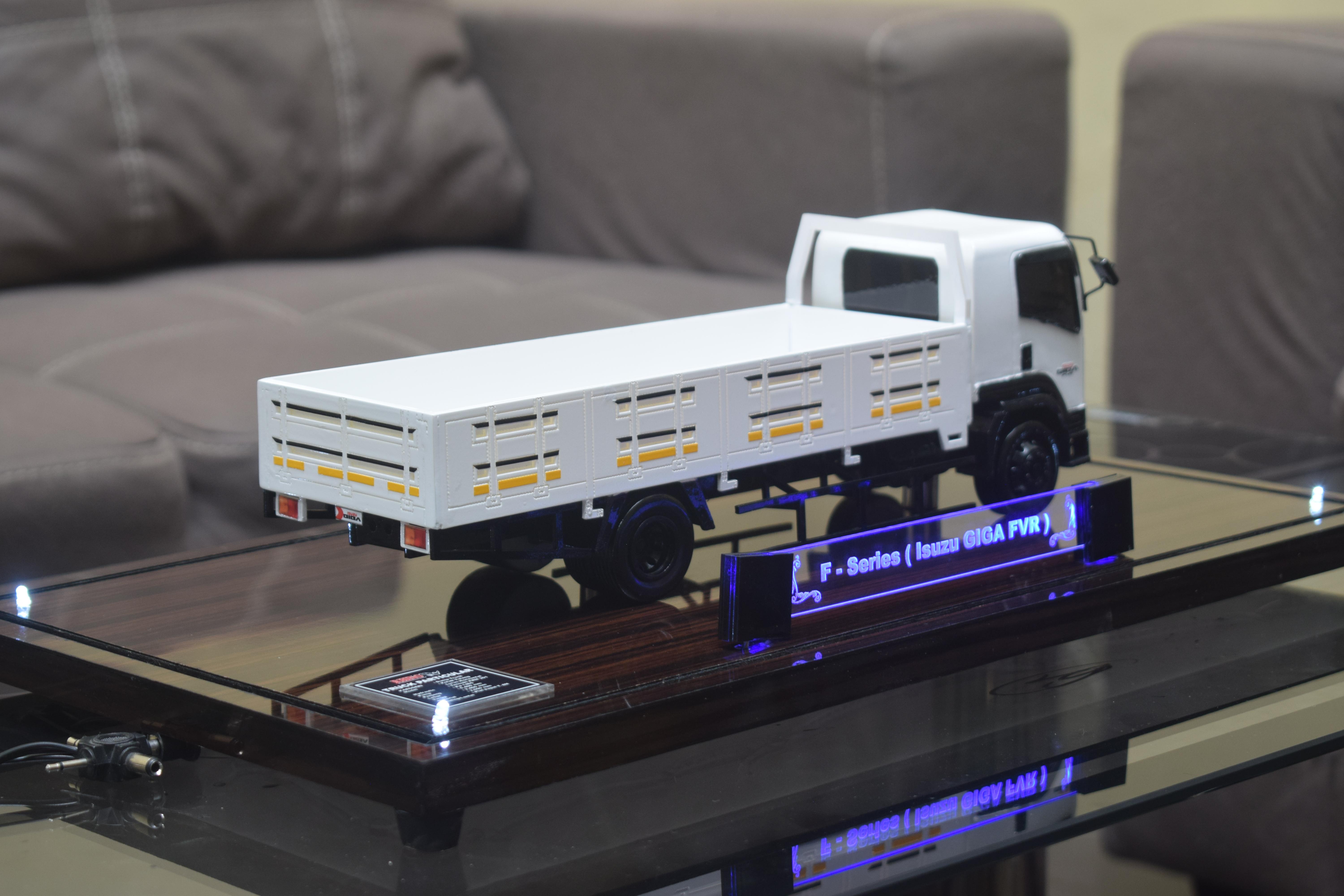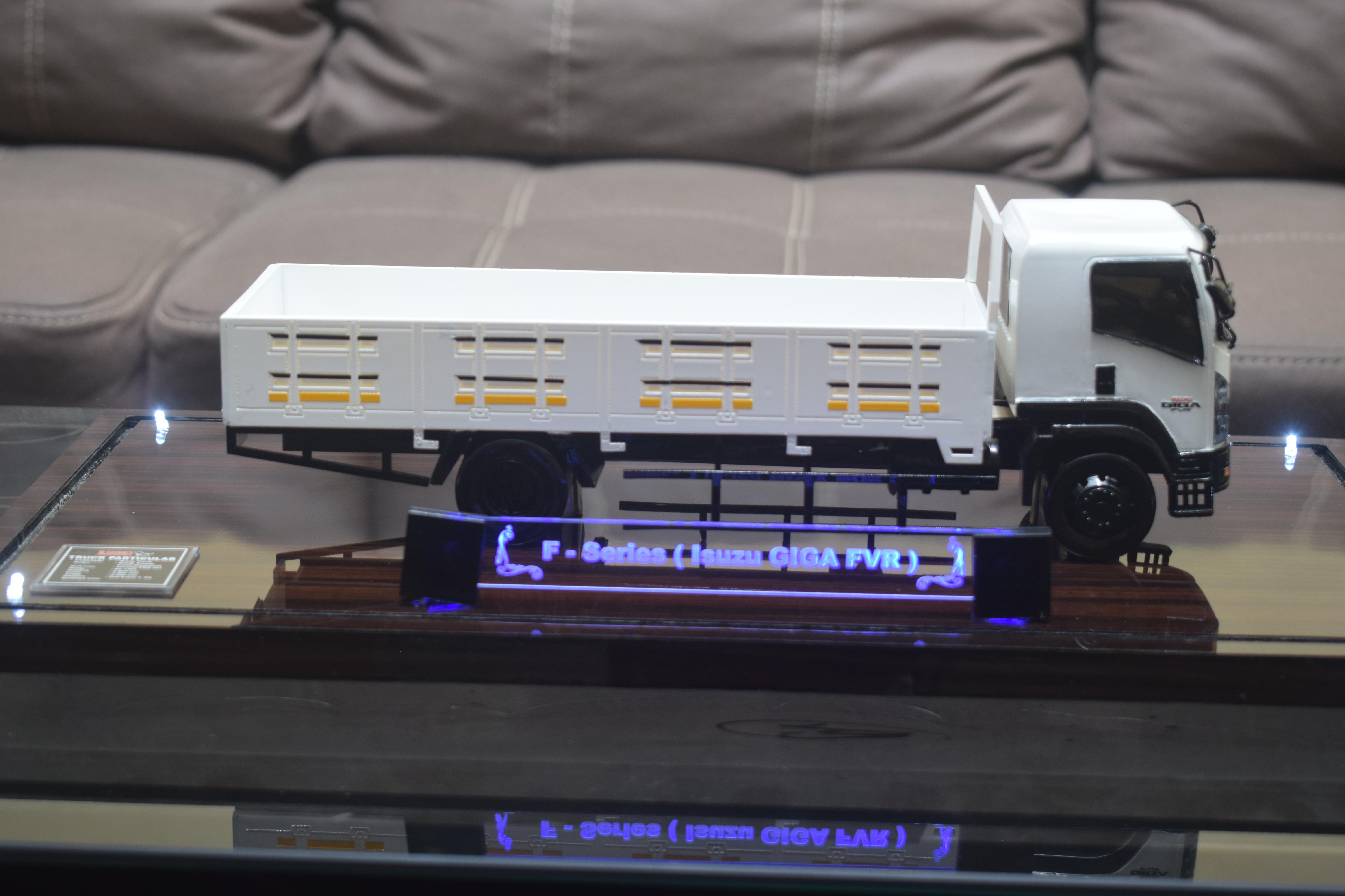 1. Miniatur Dumptruck F-Series Isuzu ini berbahan dasar fiber, acrylic, resin, artificial part, kayu sebagai tatakan serta dilengkapi pencahayaan dengan lampu led (optional), kemudian kami bingkai dengan etalase kaca (optional).