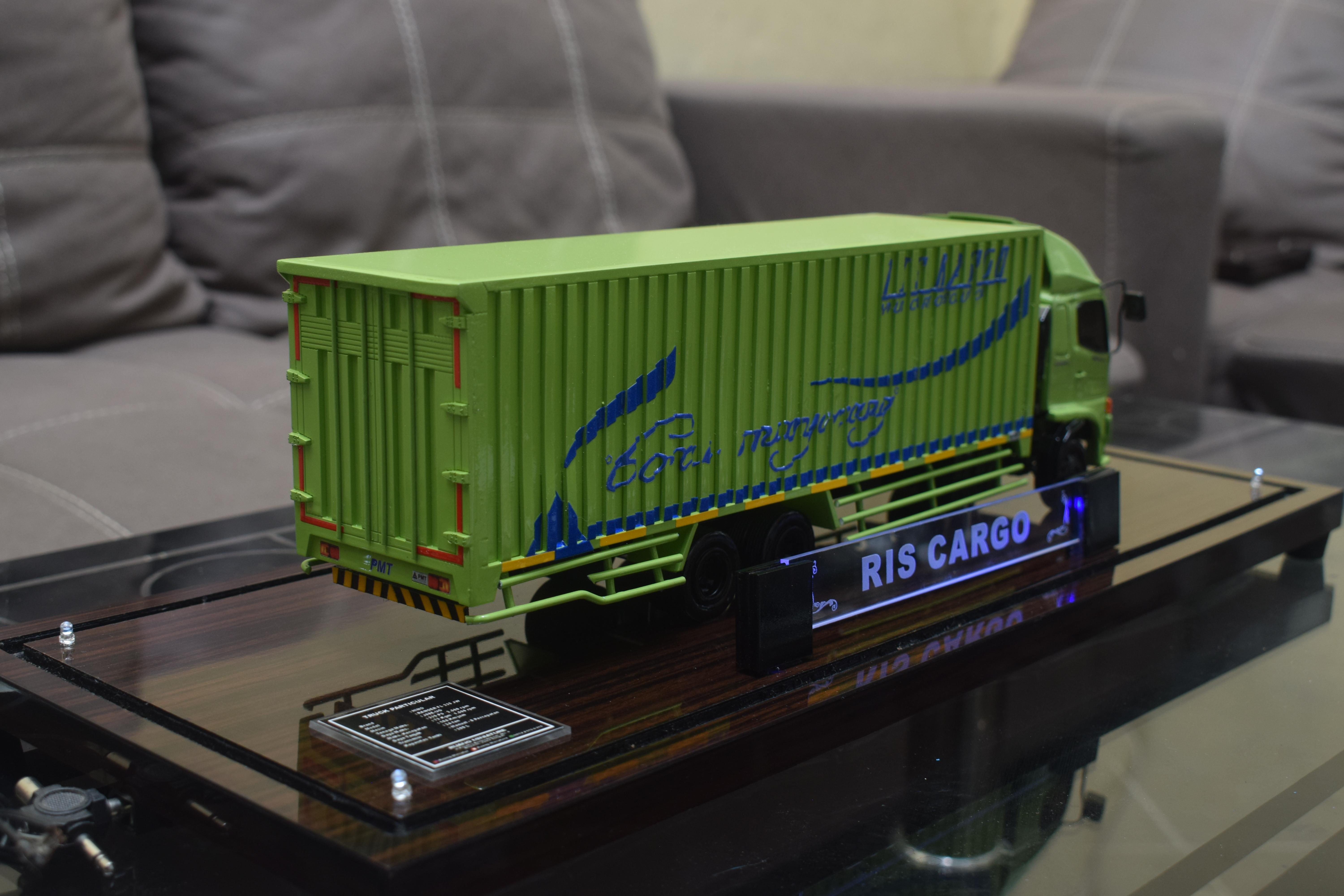 1. Miniatur Truk Kontainer RIS Cargo ini berbahan dasar fiber, acrylic, resin, artificial part, kayu sebagai tatakan serta dilengkapi pencahayaan dengan lampu led (optional), kemudian kami bingkai dengan etalase kaca (optional).