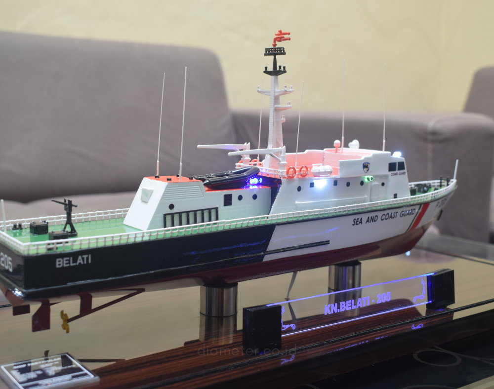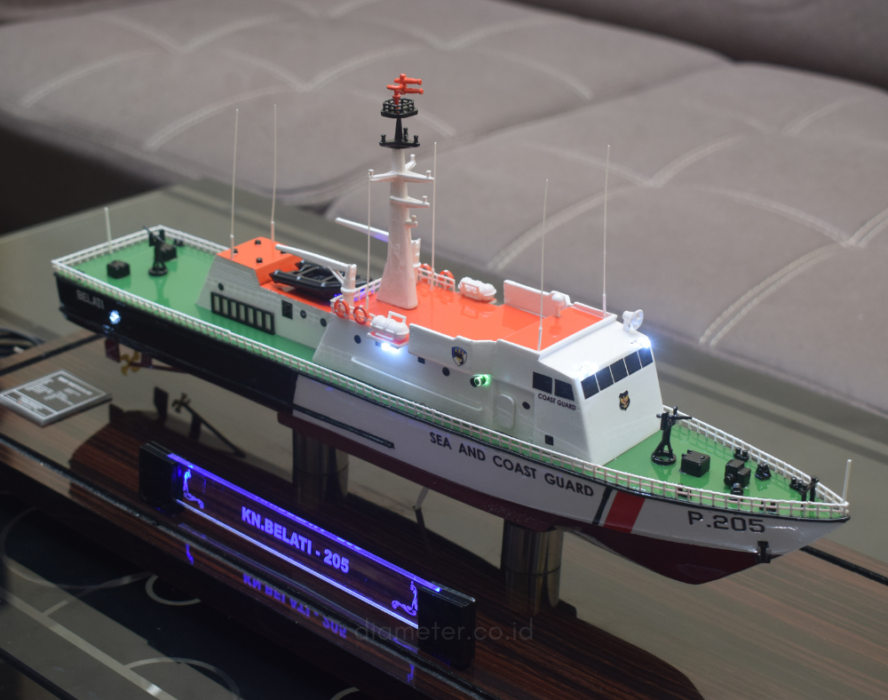 1. Miniatur Kapal KN Belati ini berbahan dasar fiber, acrylic, resin, artificial part, kayu sebagai tatakan serta dilengkapi pencahayaan dengan lampu led (optional), kemudian kami bingkai dengan etalase kaca (optional).
