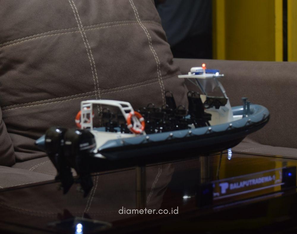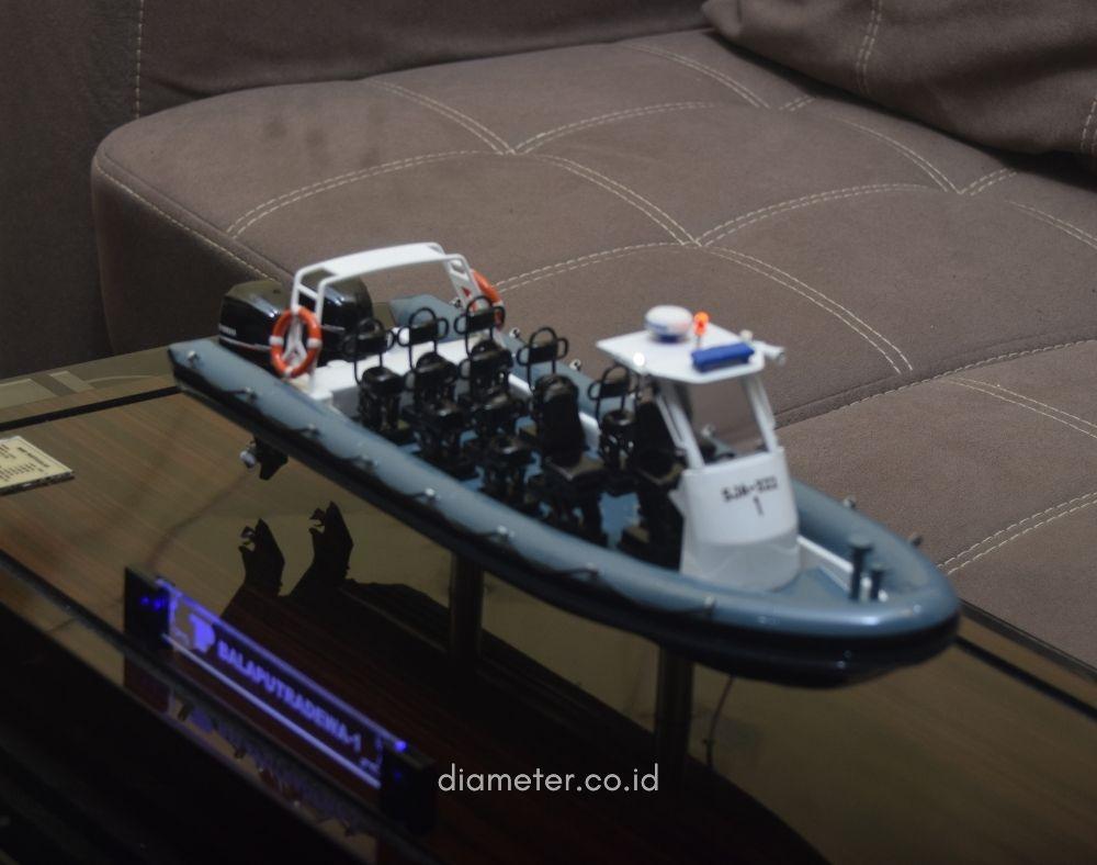 1. Miniatur Kapal RHIB Frigate SJA - 322 – 1 ini berbahan dasar fiber, acrylic, resin, artificial part, kayu sebagai tatakan serta dilengkapi pencahayaan dengan lampu led (optional), kemudian kami bingkai dengan etalase kaca (optional).
