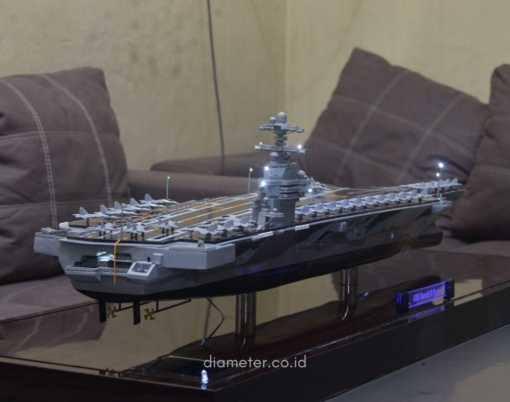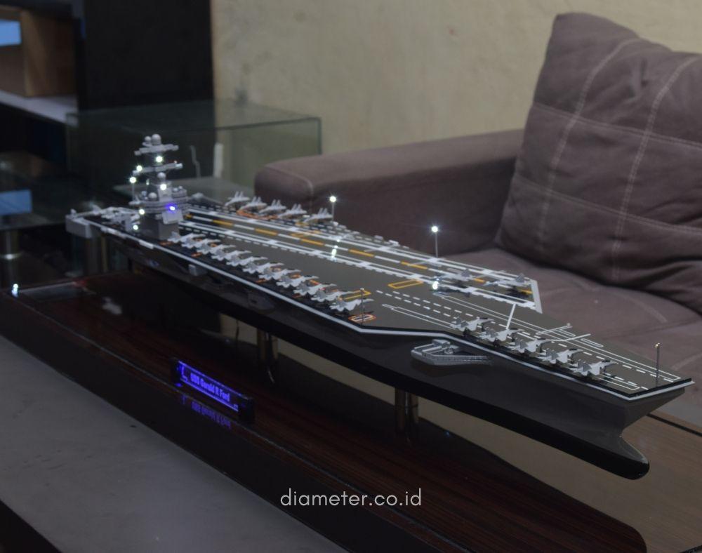 1. Miniatur Kapal Induk Gerald R Ford ini berbahan dasar fiber, acrylic, resin, artificial part, kayu sebagai tatakan serta dilengkapi pencahayaan dengan lampu led (optional), kemudian kami bingkai dengan etalase kaca (optional).